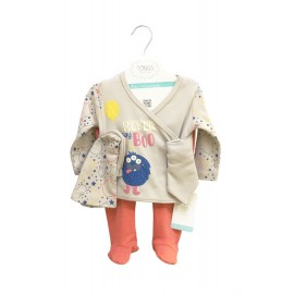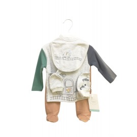 % 100 Pamuk,antialerjik kumaşdan Türkiye'de üretilmiştir.Kanserojen içermez.Dikiş Yerleri bebeğe zarar vermemesi için dış taraftadır.Hırka (cırtlı)İç ZıbınPatikli PantolonŞapkaÇorap..